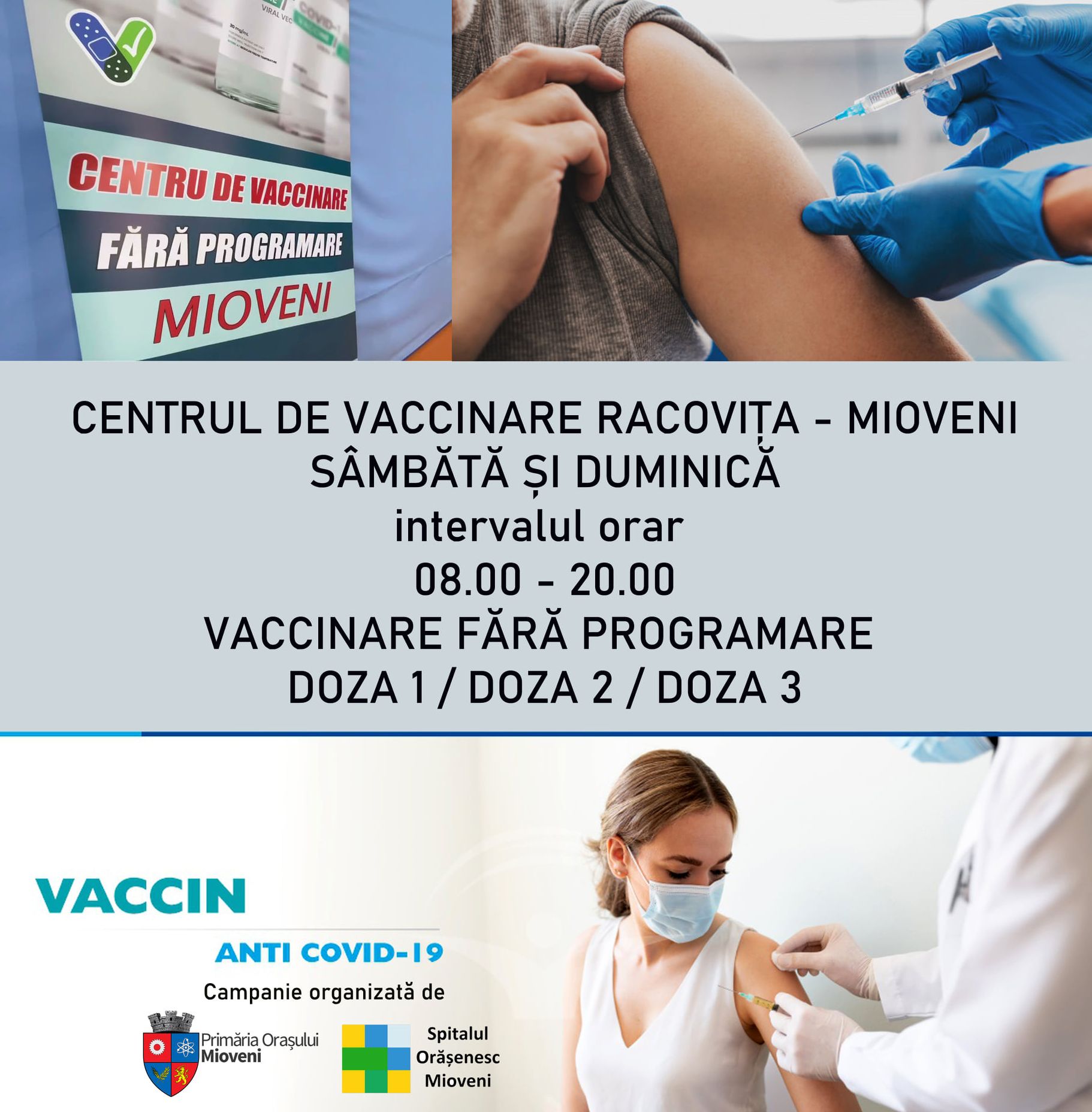 Prin urmare, sâmbătă, 16 octombrie, și duminică, 17 octombrie, cei interesați sunt așteptați la Centrul de Vaccinare Racovița, acolo unde se vor putea vaccina fără programare, în intervalul orar 08:00-20:00.
