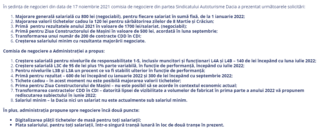 Astăzi a avut loc o nouă rundă de negocieri între Administrație și Sindicat (SAD) în vederea semnării Contractului Colectiv de Muncă pentru anul 2022 la uzina Automobile Dacia din Mioveni.