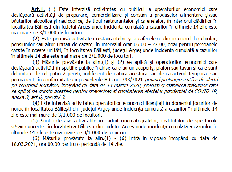 Comitetul Județean pentru Situații de Urgență (CJSU) Argeș a hotărât astăzi să impună restricții suplimentare în comuna Bălilești. Măsurile vor intra în vigoare mâine, 18 martie 2021, ora 00:00 (la noapte), și vor fi valabile timp de 14 zile. Click pe imaginea de mai jos pentru vizualizarea măsurilor restrictive:
