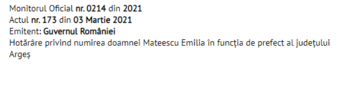 Hotărârea de numire a Emiliei Mateescu (USR) în funcția de prefect al județului Argeș a fost publicată în Monitorul Oficial.
