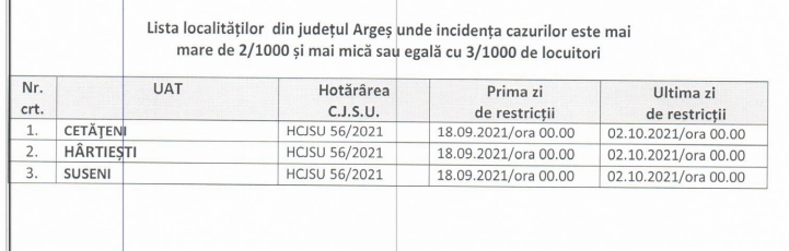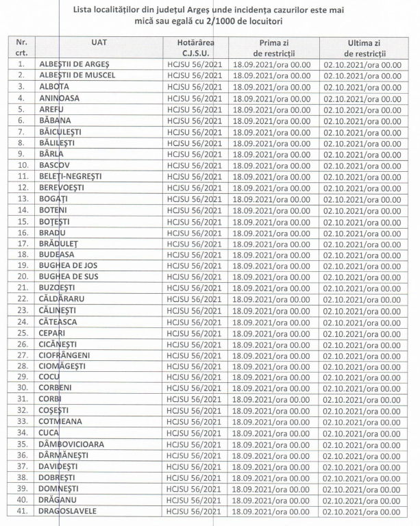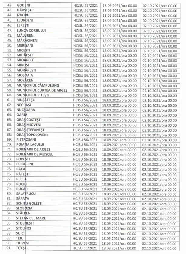 Comitetul Județean pentru Situații de Urgență (CJSU) a adoptat astăzi o hotărâre cu măsuri pentru toate localitățile din Argeș, pe fondul pandemiei. Hotărârea intră în vigoare mâine, 18 septembrie, la ora 00:00 (la noapte) (click pe imagini pentru vizualizare):