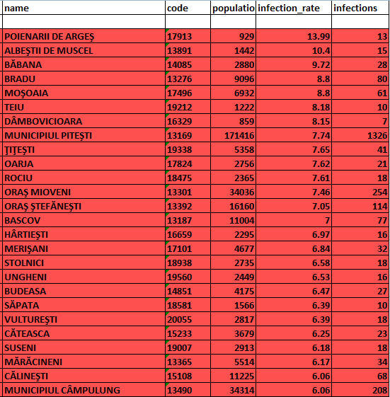 Lista actualizată azi, 13 octombrie, a localităților din județul Argeș aflate în scenariul roșu (click pe imagini pentru vizualizare):