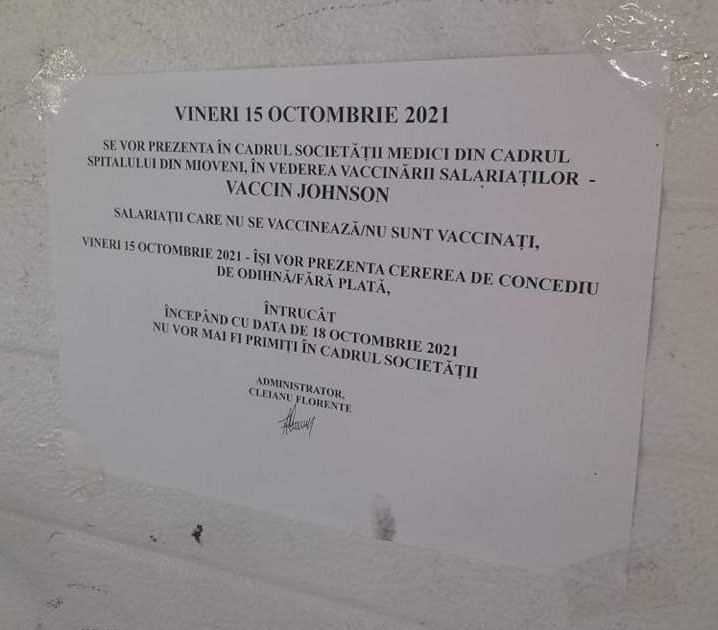 Salariații care nu se vaccinează/nu sunt vaccinați, vineri, 15 octombrie 2021, își vor prezenta cererea de concediu de odihnă fără plată, întrucât, începând cu data de 18 octombrie 2021, nu vor mai fi primiți în cadrul societății” (click pe imagine pentru vizualizare):