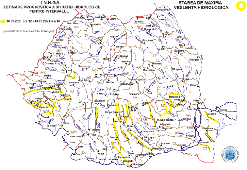 Institutul Național de Hidrologie și Gospodărire a Apelor a emis astăzi o atenționare cod galben care vizează și zone din județul Argeș (vezi harta de mai jos). Atenționarea este deja în vigoare și expiră pe 18 martie 2021, la ora 16:00.