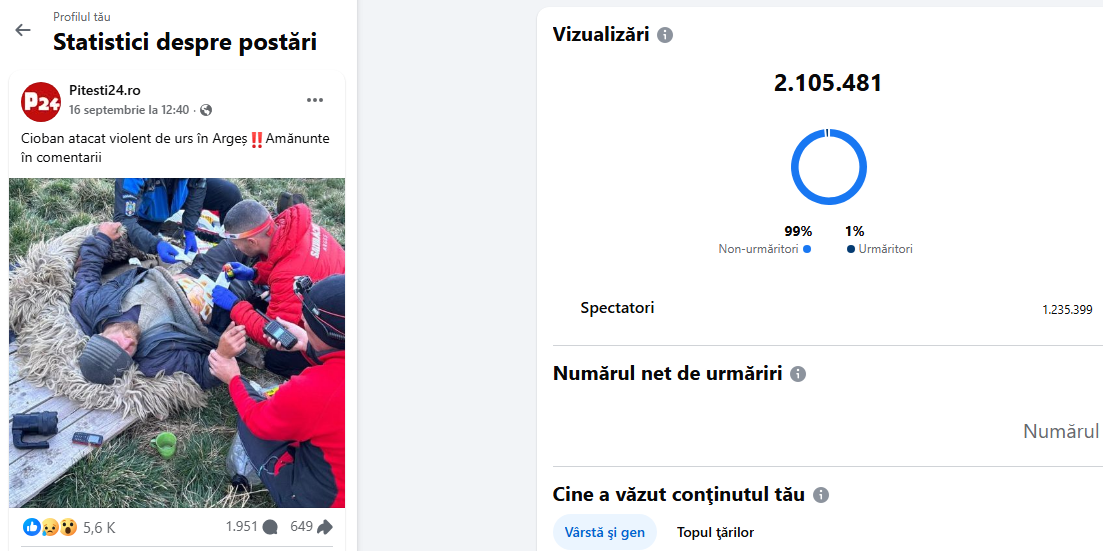 Publicația noastră a înregistrat în această lună pe pagina sa de Facebook un record de audiență, cu știrea despre ciobanul atacat de urs: peste 2,1 milioane de vizualizări. Știrea, care a provocat un uriaș interes la nivel național, a primit mai bine de 5.600 de aprecieri. De asemenea, a adunat aproape 2.000 de comentarii și a avut sute de distribuiri.