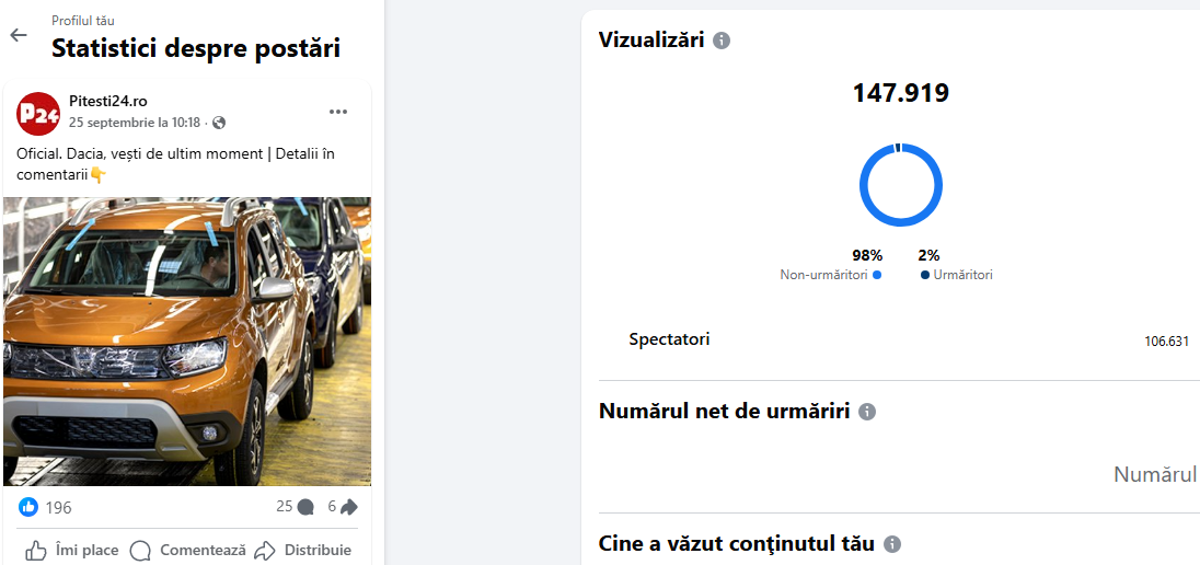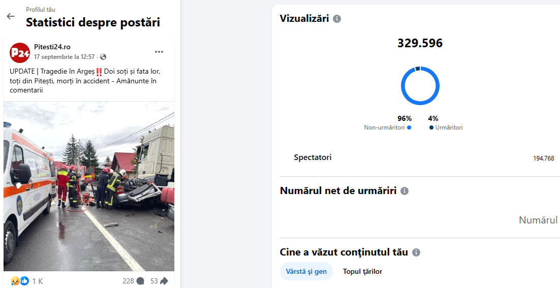 În medie, fiecare articol publicat de Pitești24.ro are între câteva zeci de mii și câteva sute de mii de vizualizări pe pagina de socializare.