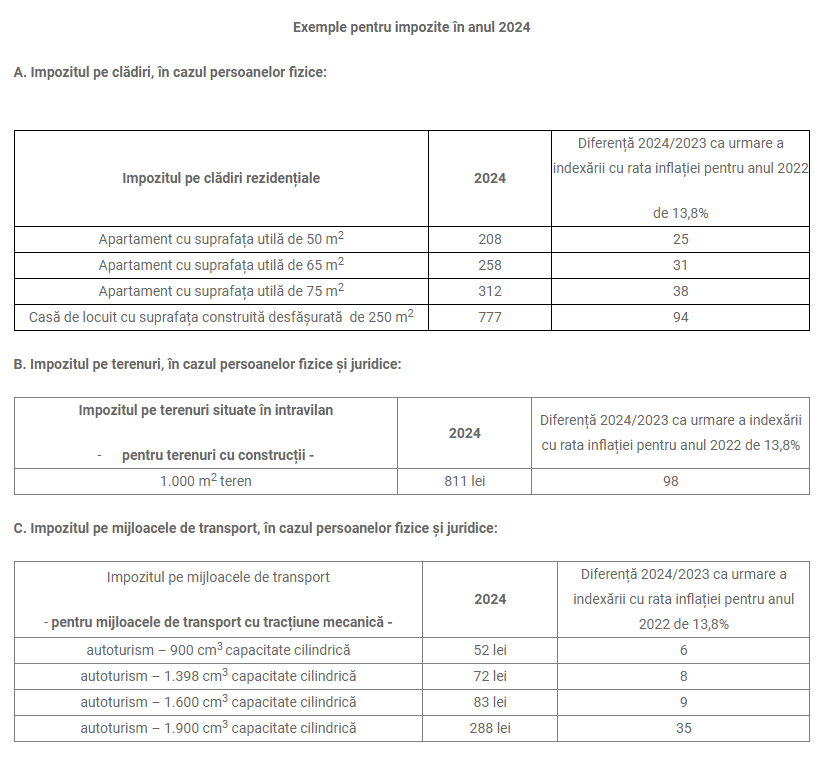 Primăria dă câteva exemple de impozite locale în Pitești după indexare, valabile în acest an (click pe imagine pentru vizualizare):