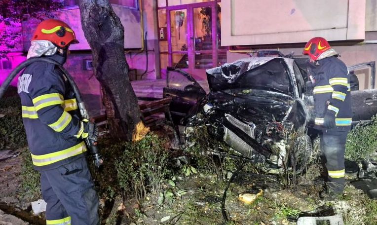 Șoferul unui autoturism a pierdut controlul asupra direcției de deplasare. Mașina a lovit un stâlp de electricitate și un copac și s-a izbit de scara unui bloc.