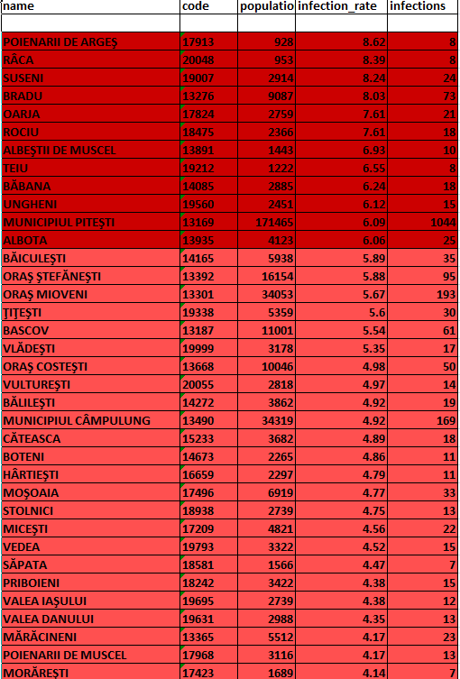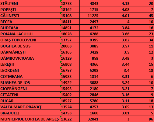 În ultimele 24 de ore, au mai depășit pragul de 6 comunele Albota, Ungheni, Băbana, Teiu, Albeștii de Muscel și Poienarii de Argeș.