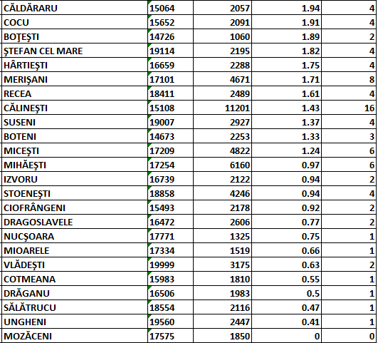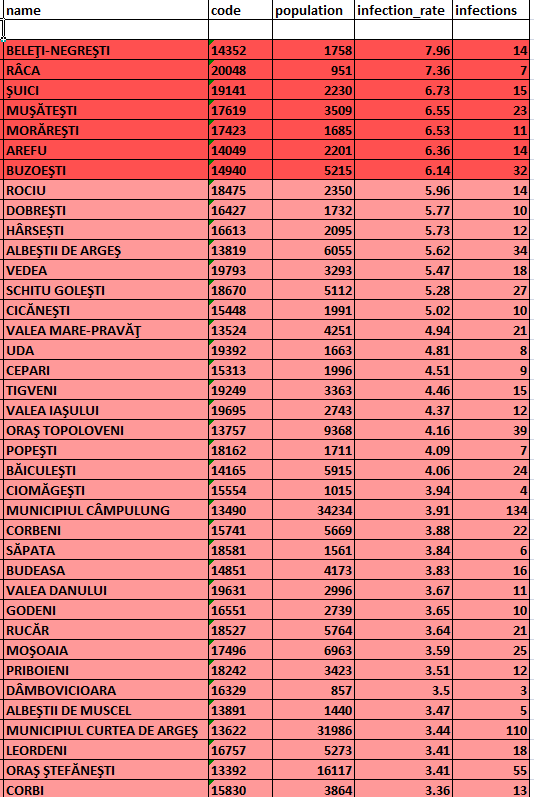 Localitatea din Argeș cu cea mai mare rată de infectare este comuna Beleți-Negrești (7,96). La polul opus se situează comuna Mozăceni, cu rată zero de infectare.