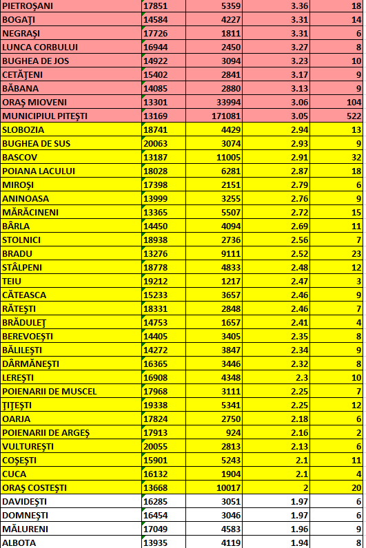 Piteștiul este la un pas să coboare sub pragul de 3 cazuri la 1.000 de locuitori (are 3,05).