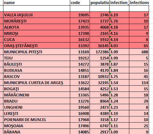 Dintre cele 20 de localități intrate în scenariul roșu, comuna Valea Iașului a depășit pragul de 6/1.000 de locuitori, dincolo de care poate fi instituită carantina totală.