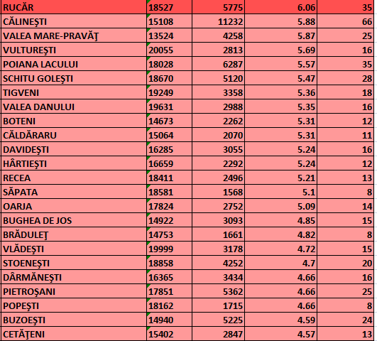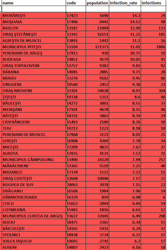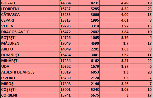Direcția de Sănătate Publică a actualizat cu puțin timp în urmă lista localităților din județul Argeș care au cele mai mari rate de infectare (click pe imagini pentru vizualizare):
