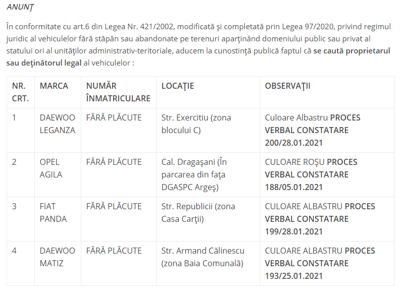 „Conform procedurii legale, au fost întocmite somații, care au fost afișate sub ștergătorul sau pe caroseria autovehiculului presupus a fi fără stăpân.