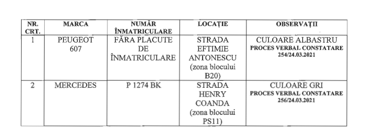 Proprietarii/deținătorii legali ai celor două mașini sau cei care pot oferi informații pentru identificarea acestora sunt rugați să se adreseze Poliției Locale Pitești:
