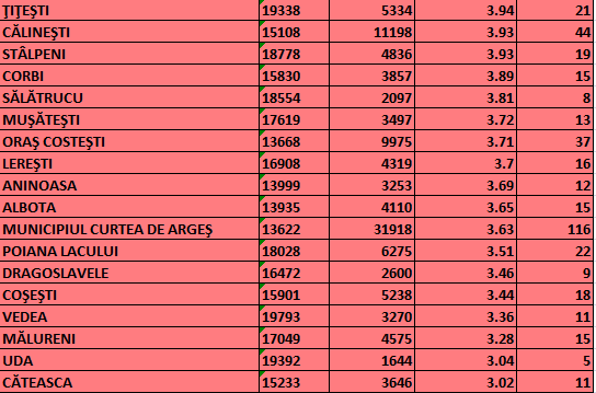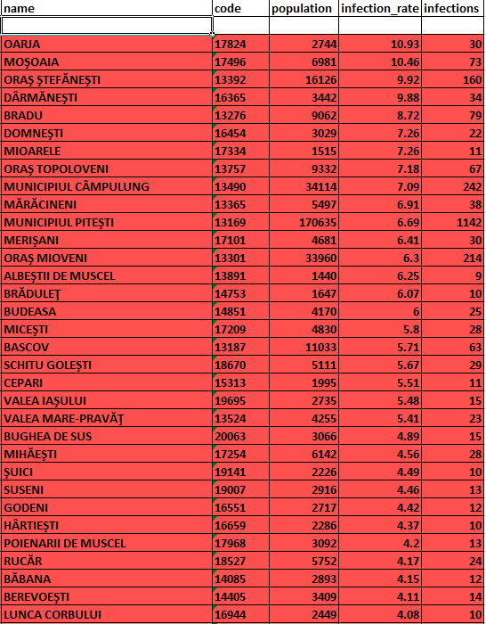 Peste 50 de localități, din totalul de 102 ale județului Argeș, se află în prezent în scenariul roșu din punct de vedere epidemiologic. Lista roșie, transmisă cu puțin timp în urmă de Direcția de Sănătate Publică (DSP):