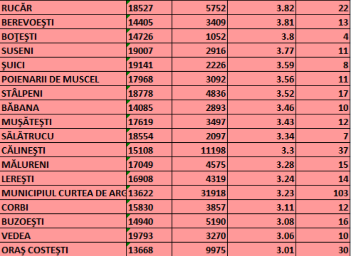 Lista localităților din Argeș aflate în scenariul roșu (cu incidență de la 3 cazuri în sus la 1.000 de locuitori), comunicată cu puțin timp în urmă de Direcția de Sănătate Publică (DSP):