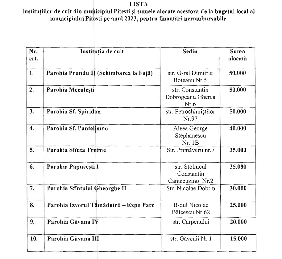 10 instituții de cult din Pitești vor primi bani de la bugetul local. Suma totală este de 350.000 de lei. Cu acești bani vor fi finanțate diverse proiecte depuse de instituțiile de cult respective. Vă prezentăm lista: