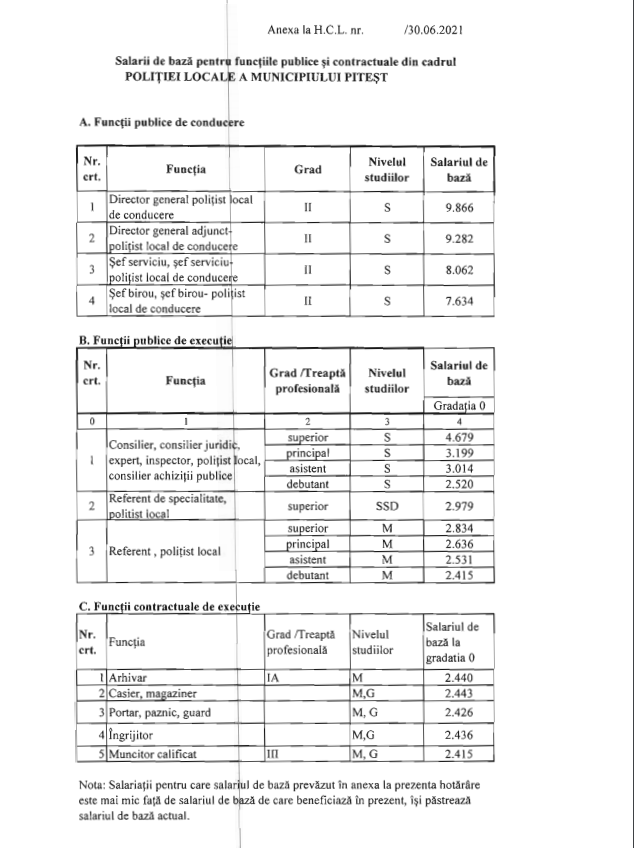 Care vor fi, de la 1 iulie 2021, noile salarii de bază în Poliția Locală Pitești dacă proiectul va fi adoptat (click pe imagine pentru vizualizare):