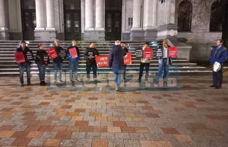 O mână de oameni inimoși au protestat în această seară în fața Curții de Apel Pitești. În liniște, fără scandări, afișând mesaje împotriva pensiilor speciale: