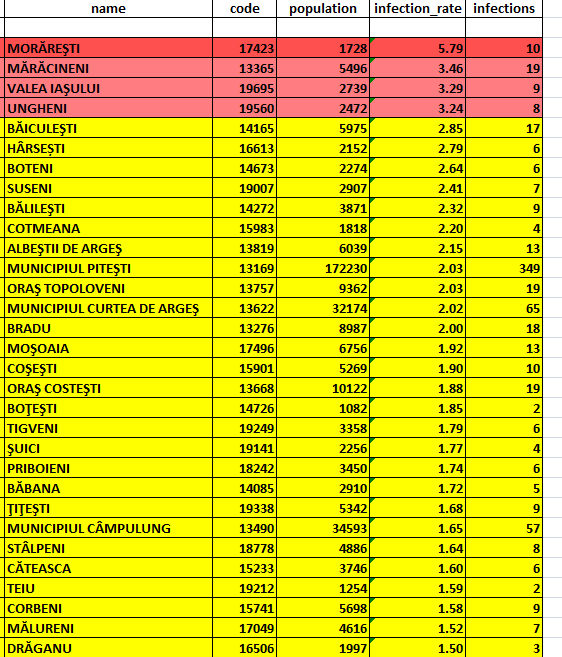 În scenariul roșu sunt 4 localități din județul Argeș, iar în scenariul galben 27 (click pe imagine pentru vizualizare):