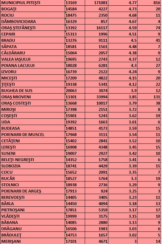 Rata de infectare cu noul coronavirus a coborât în municipiul Pitești sub pragul de 5. În ultimele 24 de ore, scăderea a fost de la 5,02 la 4,77 de cazuri la mia de locuitori.