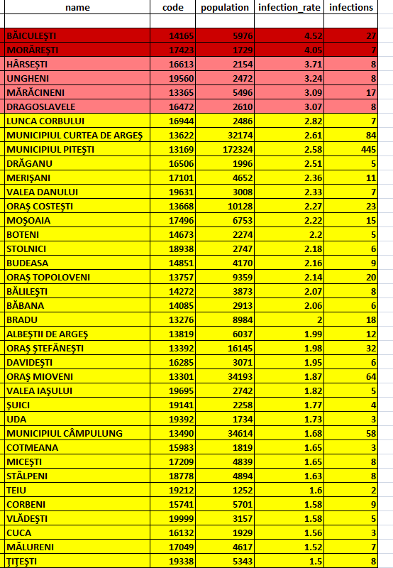 Lista localităților din județul Argeș aflate în scenariul roșu și, respectiv, scenariul galben: