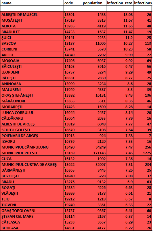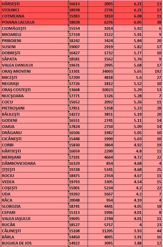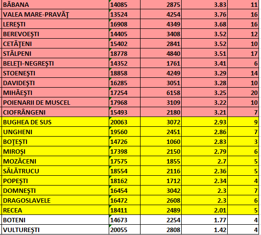 Pentru comparație, iată AICI care era situația epidemiologică în urmă cu 24 de ore în fiecare localitate din județul Argeș.