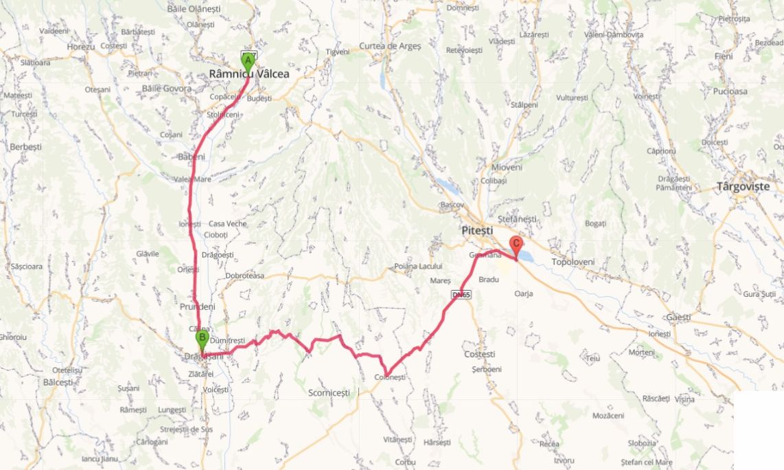 2.Sensul Pitești-Râmnicu Vâlcea: DN 65 Pitești-Slatina-Găneasa km 42+450 intersecție cu DN 64 Drăgășani-Râmnicu Vâlcea;