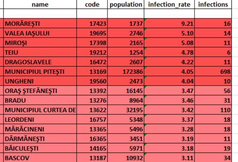 Pentru a doua zi consecutiv, rata de infectare cu SARS-CoV-2 a scăzut în Pitești, ajungând astăzi la 4,05/1.000 de locuitori, de la 4,1 în urmă cu 24 de ore. Potrivit Direcției de Sănătate Publică (DSP), la această oră sunt în scenariul roșu 15 localități din județul Argeș: