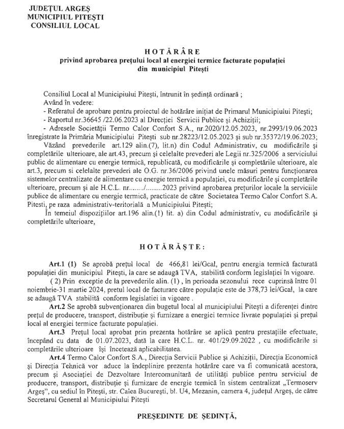 Vestea bună este că, prin excepție de la această decizie, și în următorul sezon rece (între 1 noiembrie 2023 și 31 martie 2024), ca urmare a prelungirii măsurilor guvernamentale de protejare a populației împotriva creșterilor de tarife la energia termică, și în Pitești sa va aplica un tarif redus (378,73 de lei plus TVA), iar nu cel majorat.