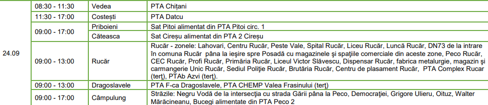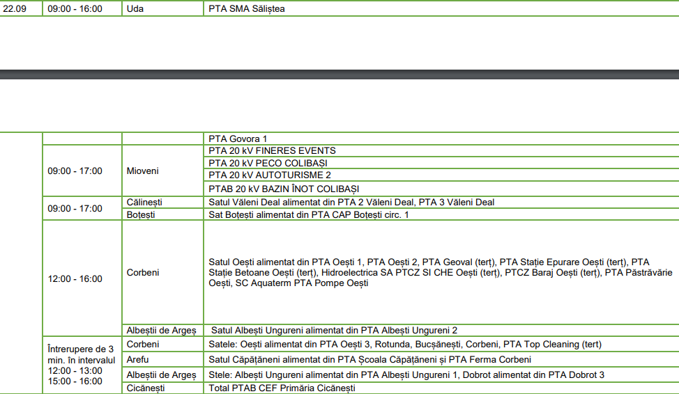 Distribuţie Oltenia anunţă întreruperea programată – pentru lucrări – a furnizării energiei electrice la consumatori casnici şi agenţi economici din Argeș în perioada 22-24 septembrie inclusiv.