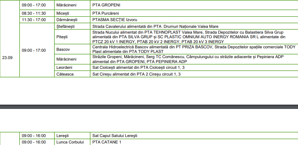 În Mioveni, furnizarea curentului electric va fi întreruptă mâine, 22 septembrie, între orele 09:00-17:00, către consumatorii alimentați de la PTA 20 kV Fineres Events, PTA 20 kV PECO Colibași, PTA 20 kV Autoturisme 2 și PTAB 20 kV Bazin de înot Colibași.