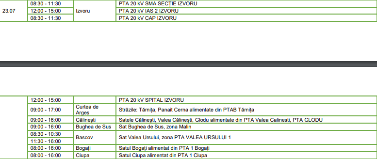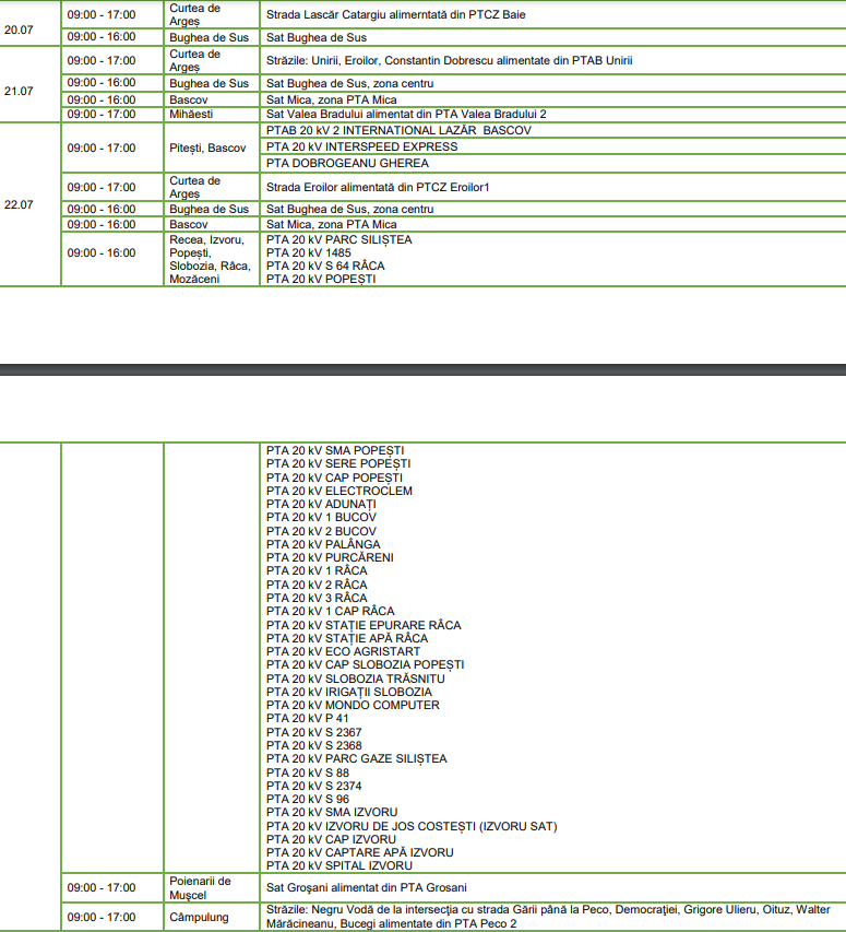 Sunt vizate diverse zone din localitățile Curtea de Argeș, Bughea de Sus, Bascov, Mihăești, Pitești, Recea, Izvoru, Popești, Slobozia, Râca, Mozăceni, Poienarii de Muscel, Câmpulung, Călinești, Bogați și Ciupa. Programul întreruperilor – pe localități, zile și intervale orare (click pe imagini pentru vizualizare):