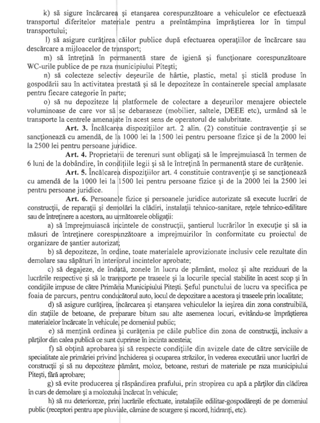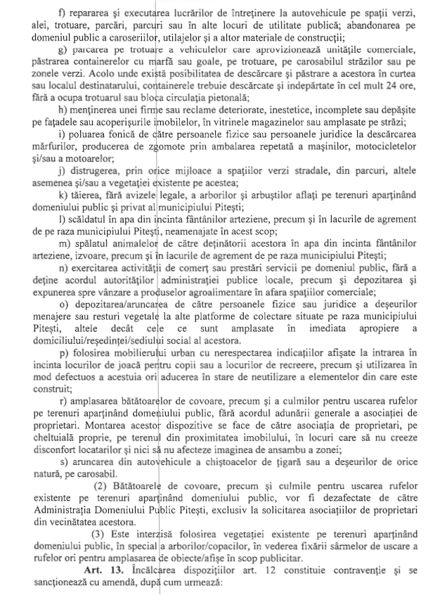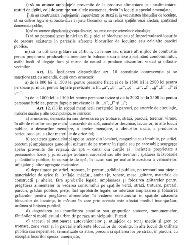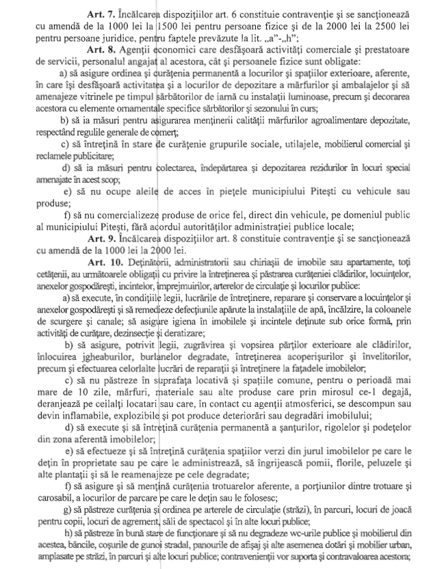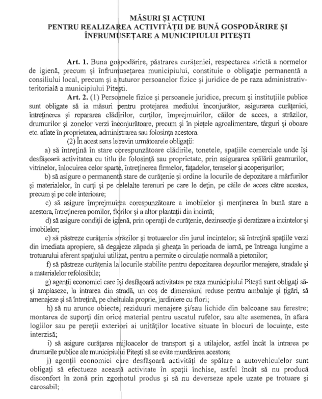 Vă reamintim că Primăria Pitești a adunat laolaltă reguli vechi și reguli noi și propune un proiect cu „măsuri și acțiuni pentru realizarea activității de bună gospodărire și înfrumusețare a municipiului”. Probabil încă un proiect inutil: nu puține dintre regulile deja existente nu au fost niciodată respectate și nici Primăria nu s-a arătat interesată să vegheze la respectarea lor.