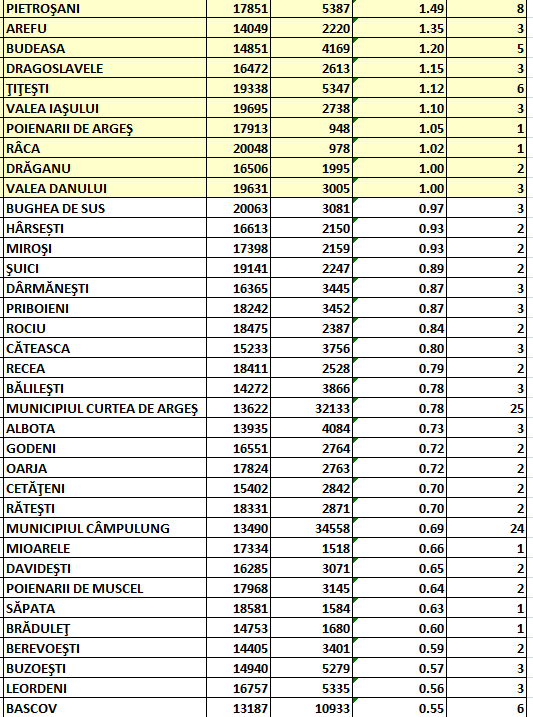 Singurele două localități din județul Argeș care continuă să se afle în scenariul roșu sunt comunele Cepari și Nucșoara. În scenariul galben mai sunt comunele Vulturești, Lerești și Cotmeana, potrivit Direcției de Sănătate Publică: