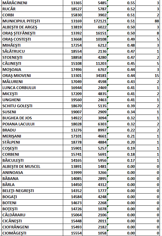 Piteștiul rămâne pe un trend descendent din punct de vedere epidemiologic. În ultimele 24 de ore, rata de incidență a cazurilor de infectare cu SARS-CoV-2 a scăzut de la 0,53 la 0,51/1.000 de locuitori. Datele epidemiologice la zi în localitățile argeșene care sunt în scenariul verde: