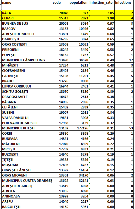 Datele epidemiologice pentru 9 iunie în toate localitățile argeșene, comunicate de Direcția de Sănătate Publică (pentru vizualizare, click pe imagini):