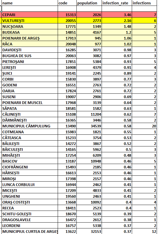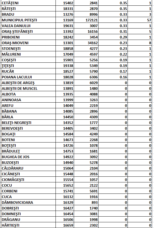 Răsturnare de situație în Cepari: comuna a revenit în scenariul roșu. Este cea mai importantă noutate a ultimelor 24 de ore din punct de vedere epidemiologic în ceea ce privește județul Argeș. Piteștiul rămâne cu o rată de incidență de 0,33/1.000 de locuitori, la fel ca acum 24 de ore. Datele epidemiologice la zi din toate localitățile argeșene, comunicate de DSP: