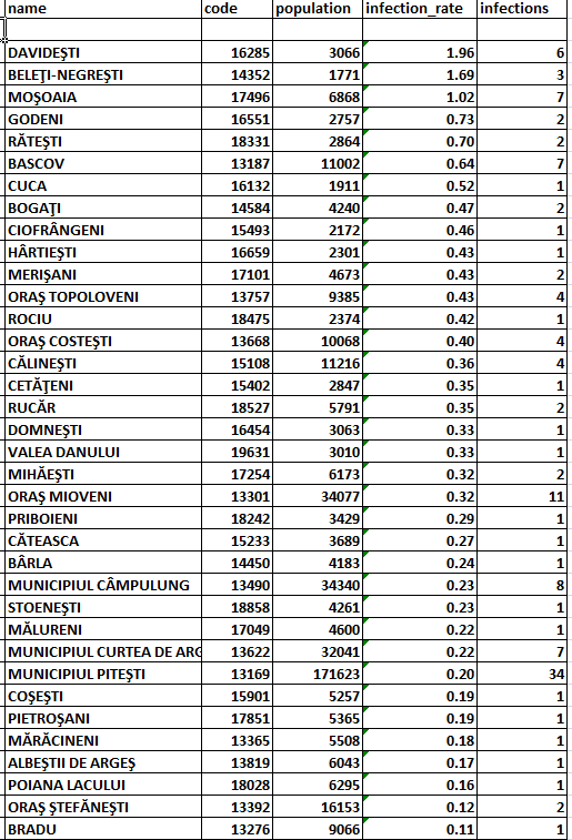 Comuna Davidești rămâne cu cea mai mare rată de incidență a cazurilor de infectare (1,96/1.000 de locuitori), iar municipiul Pitești are cele mai multe cazuri (34) (click pe imagine pentru vizualizare):