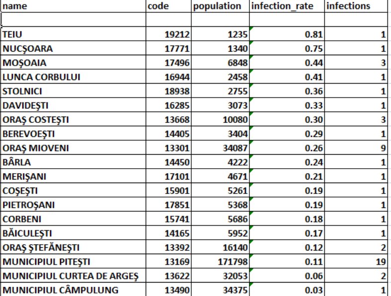 Potrivit sursei citate, cazuri de infectare cu SARS-CoV-2 există în 19 dintre cele 102 localități ale Argeșului (click pe imagine pentru vizualizarea listei):