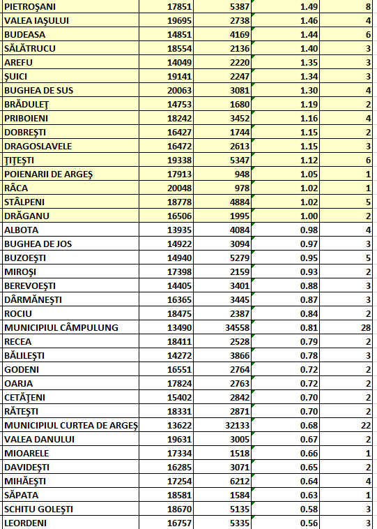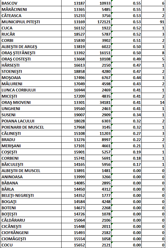 Celelalte localități argeșene se află în scenariul verde. În municipiul Pitești, în ultimele 24 de ore rata de incidență a cazurilor de infectare cu noul coronavirus a scăzut de la 0,58 la 0,53/1.000 de locuitori. Situația epidemiologică la zi în localitățile care sunt în scenariul verde (click pe imagini pentru vizualizare):
