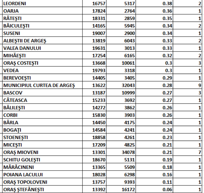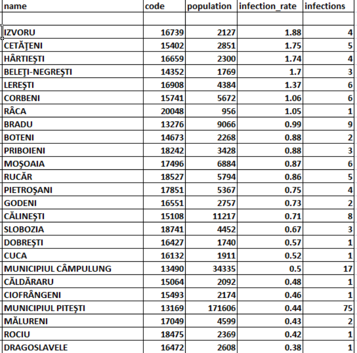 Comuna Izvoru este localitatea din județul Argeș care are cea mai ridicată rată de incidență (1,88/1.000 de locuitori), în timp ce municipiul Pitești înregistrează cele mai multe cazuri de infectare active (75), cu 14 mai multe decât acum 24 de ore (click pe imagini pentru vizualizarea situației epidemiologice în fiecare dintre localitățile argeșene care au cazuri active de COVID-19):