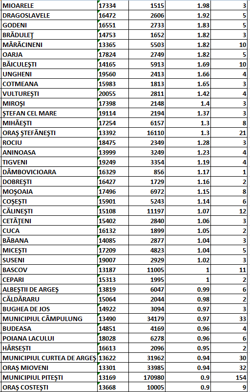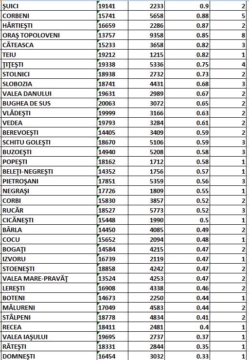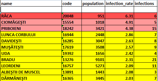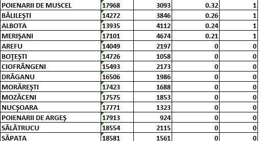 Potrivit sursei citate, în scenariul roșu (cu incidență peste 3 la mia de locuitori) se mai află doar comunele Râca, Ciomăgești și Priboieni.