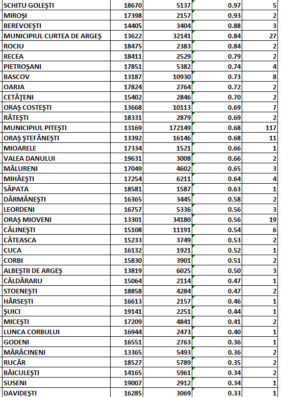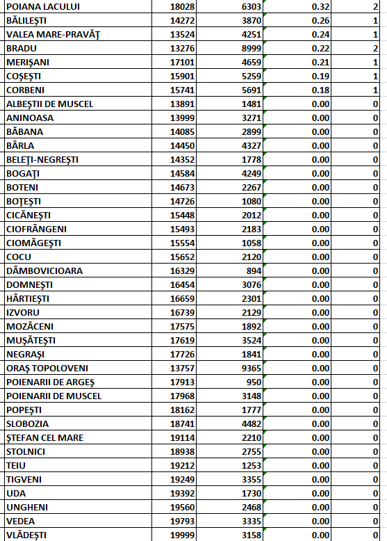 Celelalte localități din Argeș sunt în scenariul verde. În Pitești, în ultimele 24 de ore rata de incidență a cazurilor de infectare cu SARS-CoV-2 a scăzut de la 0,75 la 0,68/1.000 de locuitori. Click pe imagini pentru vizualizarea listei localităților din Argeș care sunt în scenariul verde: