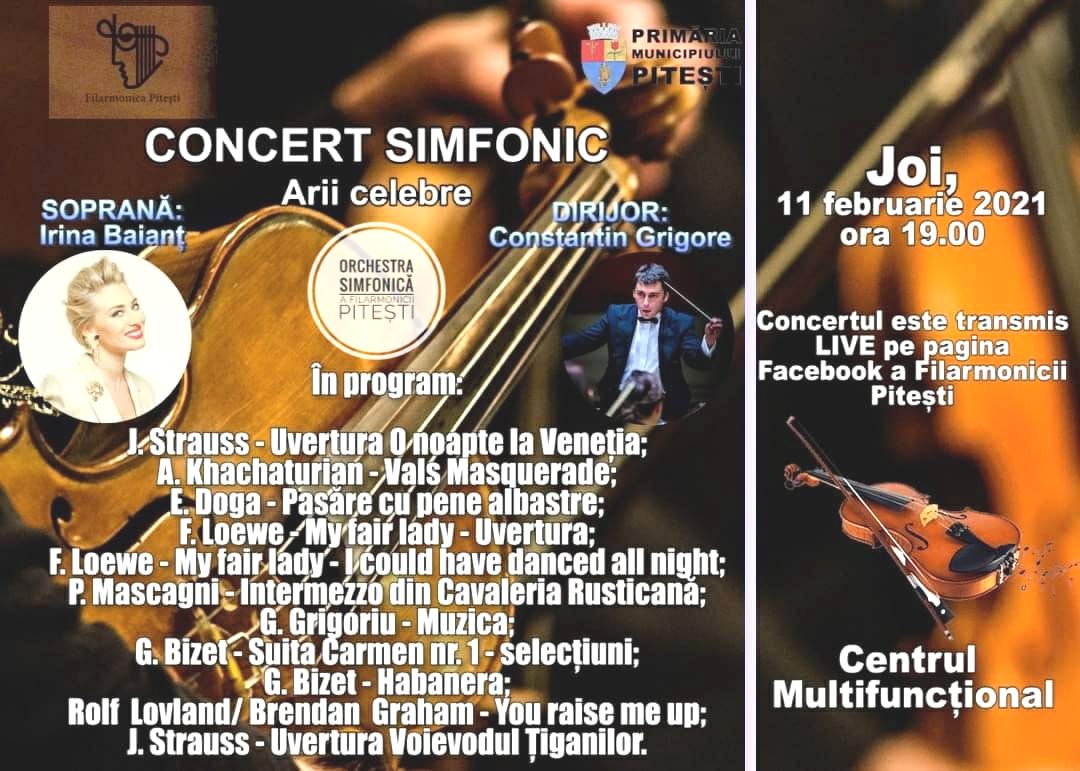 Filarmonica Pitești vă invită joi, 11 februarie 2021, de la ora 19:00, la sediul său de la Centrul Multifuncțional, la primul concert vocal-simfonic cu spectatori, în limita a 30% din numărul de locuri, pe fondul pandemiei de COVID-19. Spectatorii vor purta măști de protecție și se vor așeza pe locurile disponibile din sală.