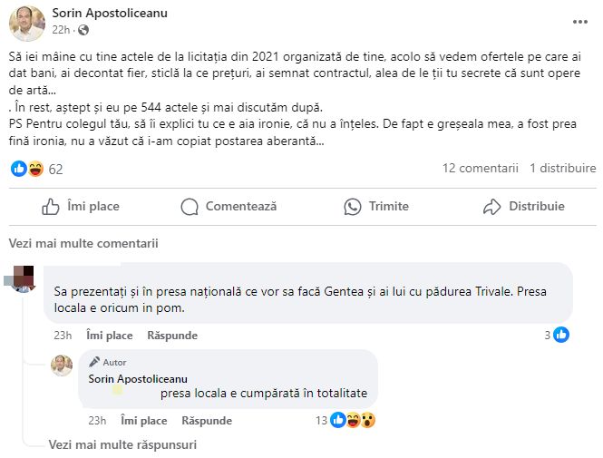 Intru astăzi pe pagina de socializare a lui Sorin Apostoliceanu și văd negru în fața ochilor. “Presa locală e cumpărată în totalitate”, scrie apăsat consilierul local PNL răspunzând unui comentariu despre intențiile îndoielnice ale primarului PSD Cristian Gentea și ale oamenilor săi în ceea ce privește Pădurea Trivale și despre faptul că presa din Pitești nu ar reflecta subiectul. Comentariul este scris de un piteștean la o postare a lui Apostoliceanu despre un alt subiect sulfuros: prețul exorbitant al noilor stații de autobuz.