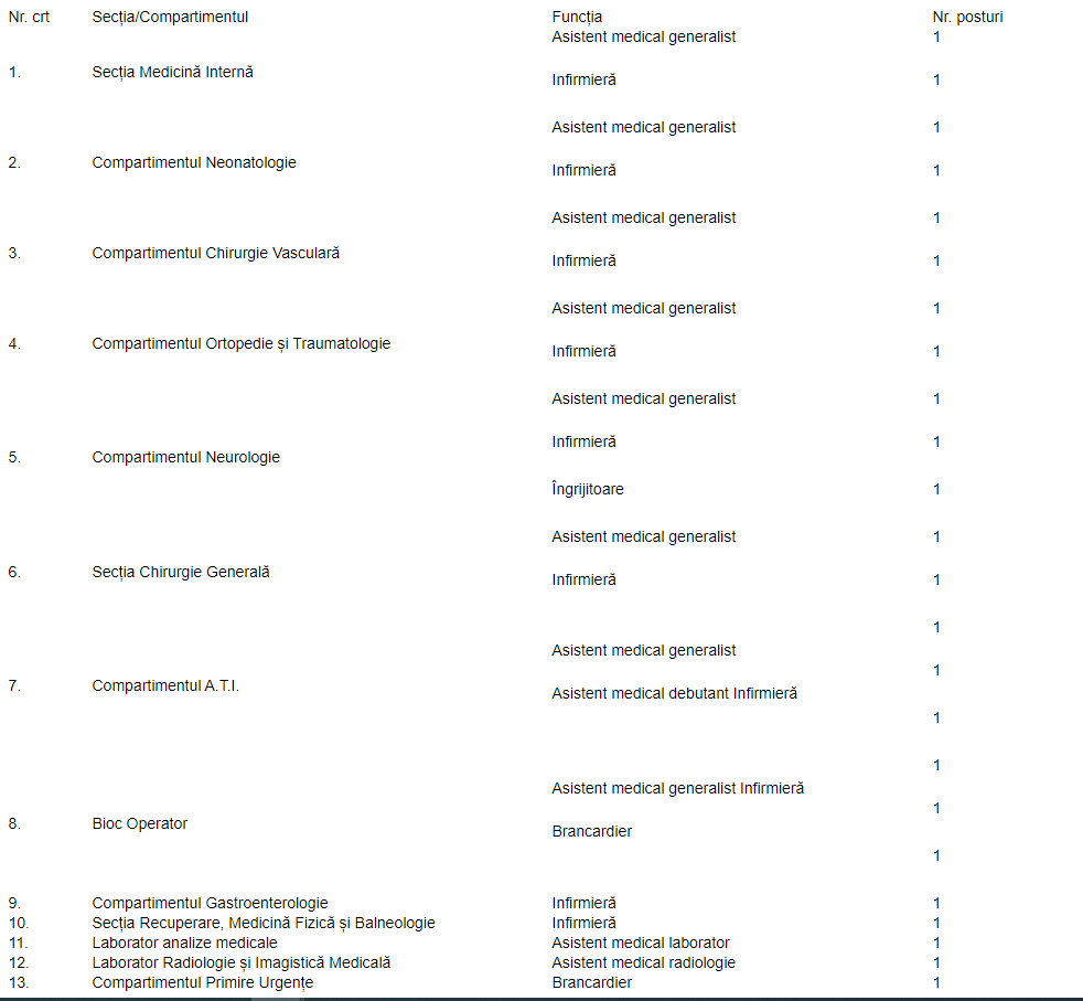 Spitalul Orășenesc Mioveni scoate la concurs 24 de posturi. Angajările vor fi făcute pe perioadă nedeterminată. Posturile scoase la concurs: