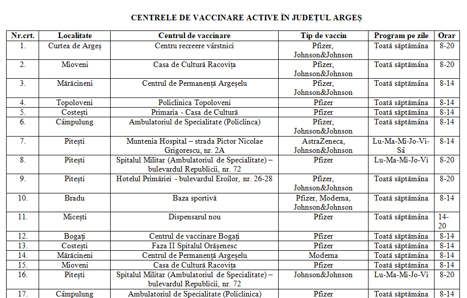 La cererea Pitești 24, Instituția Prefectului a actualizat și a dat publicității în urmă cu puțin timp lista centrelor active de vaccinare anti-COVID din județul Argeș (click pe imagine pentru vizualizare):