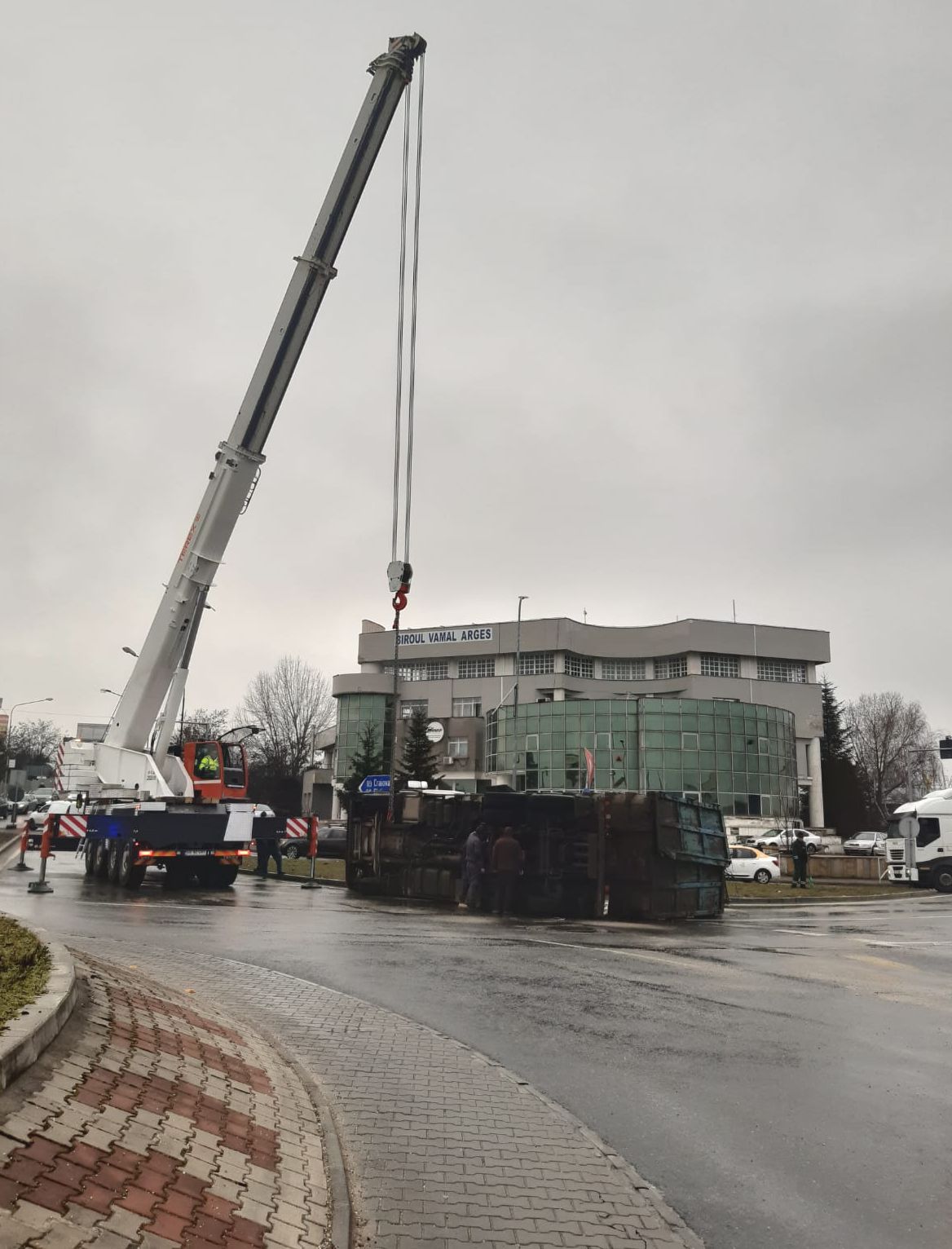 Autoutilitara, încărcată cu deșeuri menajere, s-a răsturnat din cauza vitezei cu care a circulat șoferul (un bărbat în vârstă de 59 de ani din București), viteză neadaptată la condițiile meteo-rutiere (în Pitești plouă, iar carosabilul este ud).
